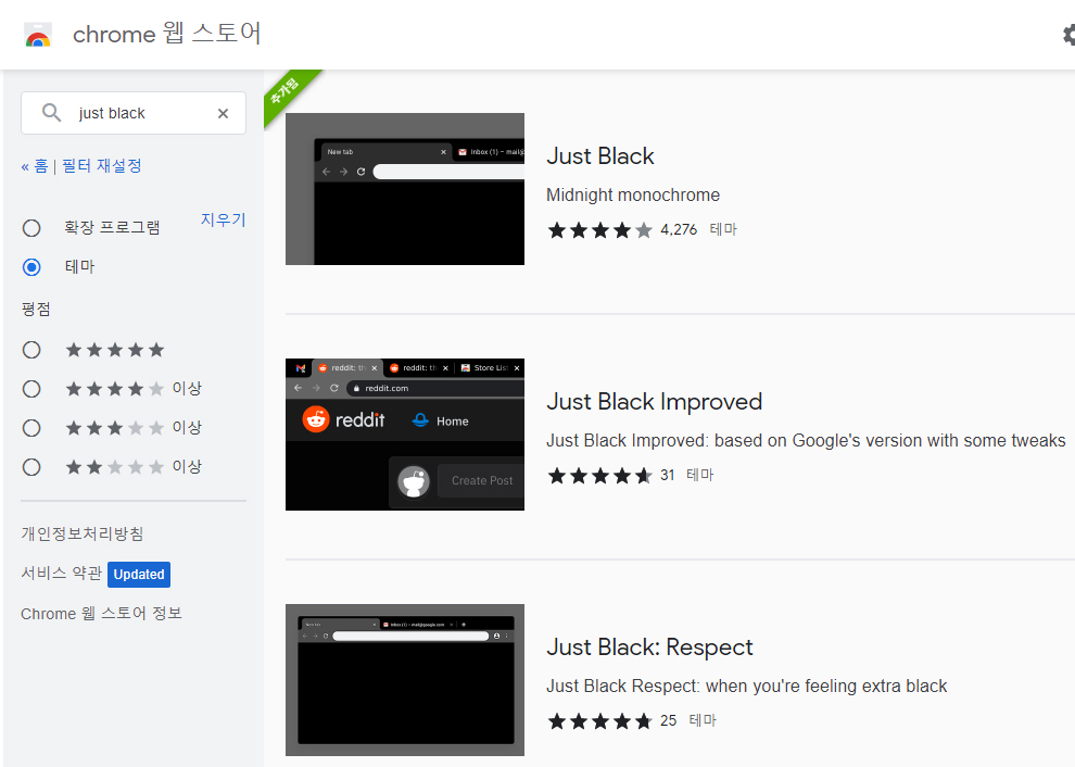 2. "테마(Themes)"를 클릭해 테마를 선택합니다. 섹션에서 "just black"을 검색하여 크롬에 추가해 줍니다.
