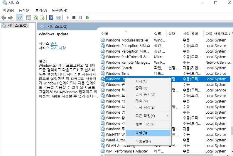위의 창이 뜨면 abc순으로 되어있으니 "Windows Update"를 찾아 마우스 오른쪽 키를 눌러 '속성'을 클릭한다.