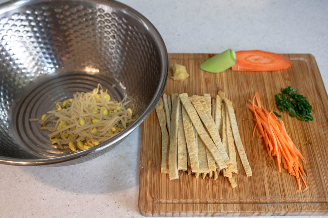 [재료] =2인분 콩나물 25g 식용유 2큰술 다진마늘 1/2작은술 파 5cm 당근 15g 사각어묵 2장 진간장 1작은술 소금 약간 |